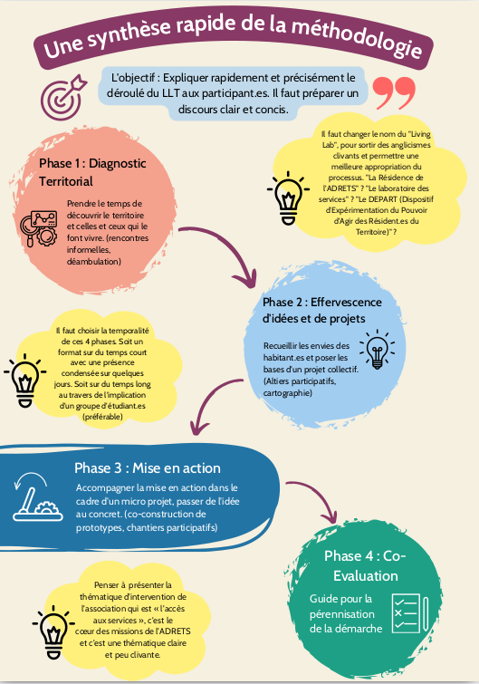 Le dispositif de living lab se veut comme une méthode dans laquelle les citoyen.ne.s, collectifs d’habitant.e.s, usager.e.s, associations sont considéré.e.s comme des acteurs et actrices essentiel.le.s des processus de recherche et d’innovation. Nous ne revendiquons pas la maternité de cette méthode d'action sur le territoire, mais nous avons développé celle-ci en nous inspirant de la littérature et d'exemples de résidences territoriales déjà existants et ayant fait leur preuve. Cette approche permet de développer des solutions innovantes, adaptées au territoire et tirant parti de ses ressources, tout en intégrant la population à chaque étape du processus, pour co-construire et co-évaluer les expérimentations basées sur les attentes et les souhaits des résident.e.s. Dans ce contexte, une innovation n’est pas nécessairement une méthode inédite, mais peut également désigner une démarche qui n'a pas encore été mise en œuvre sur le territoire concerné.